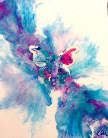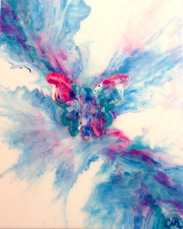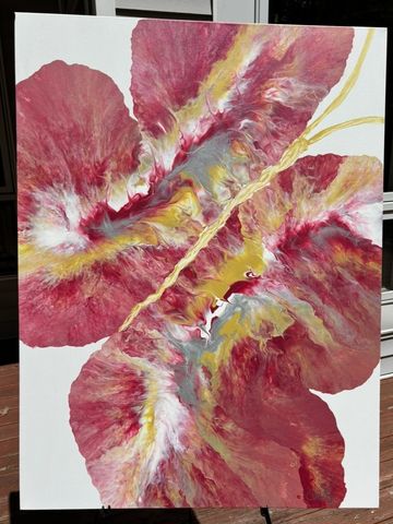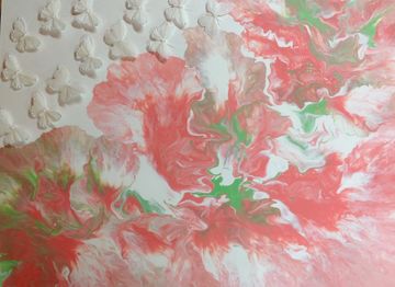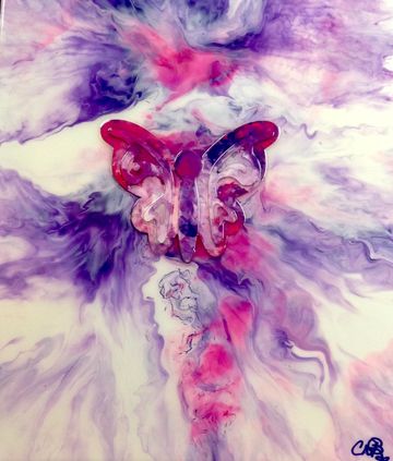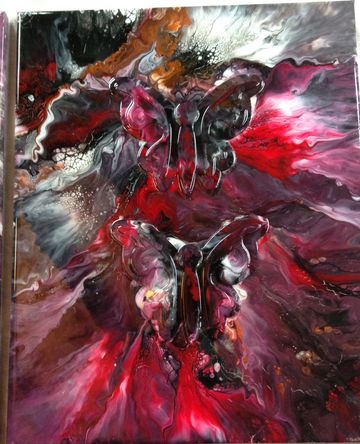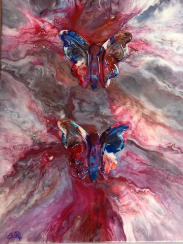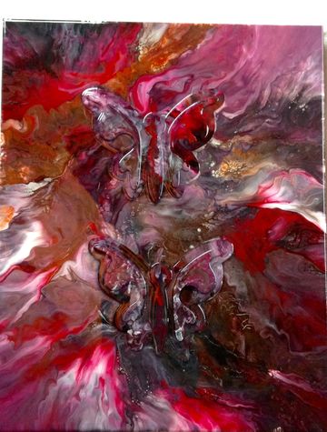 A whimsical burst of color takes flight—red, pink, black, white, and a hint of yellow swirl together, forming an abstract butterfly dancing between motion and imagination.