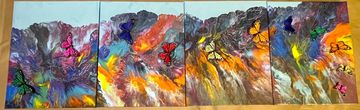This amazing 4 piece set is a show stopper. If you love butterflies like I do, display this piece in a bedroom or livingroom as you stare into the beauty of nature everyday. This magnificent set displays 11 beautiful butterflies showcasing their beauty as they glide through sky blue rainbow skies. This piece was created to display on your wall as one piece, however feel free to display as you like.