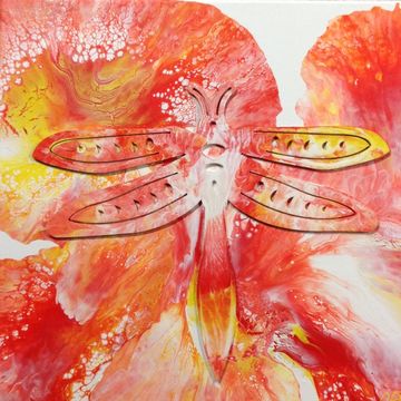 “Metamorphosis” reveals a bold butterfly in rich pink, rosegold, yellow, and white, its wings unfolding against a white canvas in a radiant dance of transformation and light.