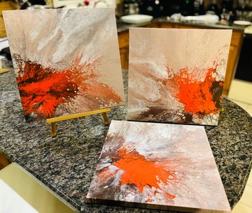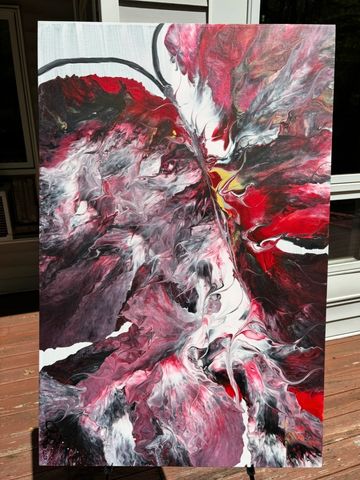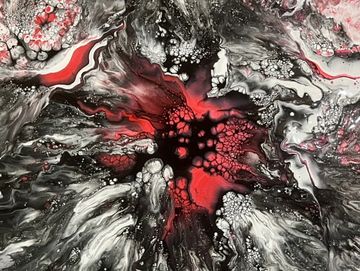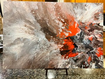 “Fire and Ice” ignites with bold red flames and cool gray whispers, black and white dancing between heat and stillness, a striking balance of passion and calm.