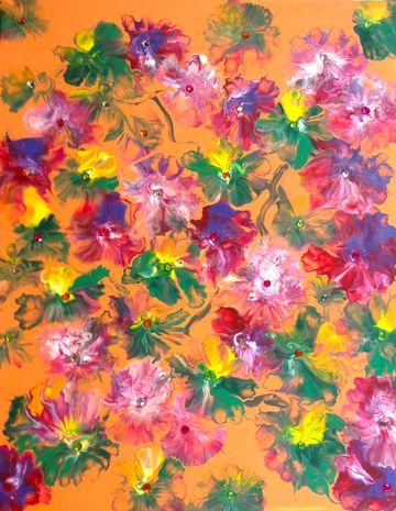 Against a canvas of orange hue, a floral mix, a captivating view.