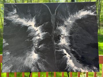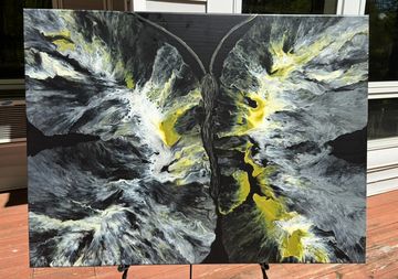Soft wings in black, white, and gray flutter like an eclipse across the canvas.