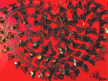 On fiery red, translucent emerald butterflies take flight, their colors alive and untouchable as love takes flight.